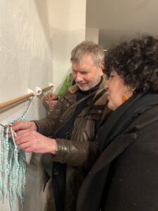 Die Knotenschrift der Inka ist bis heute rätselhaft. Ute Diez ist eine Künstlerin in Kiel, die schon sehr früh begann, auch haptisch zu arbeiten. Schon als Kind erdachte sie eine Knotenschrift. Dass deren Code sich entschlüsseln lässt, wenn man die Position eines Buchstabens im Alphabet kennt, legt es nahe, das Braille-Alphabet zur Decodierung heranzuziehen.